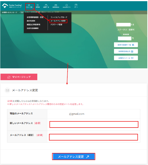 4.新しいメールアドレスを入力し、メールアドレス変更をクリックし、送信