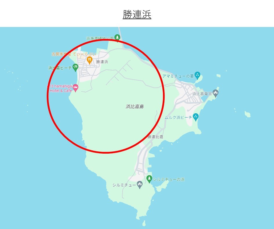 対象物件は、浜比嘉大橋からも車で2分程のアクセスの良い場所に位置しており、浜比嘉島の西海岸にあたる「浜比嘉ビーチ」沿いにある整地となります。浜比嘉ビーチは島の中でも特に美しい真っ白な砂浜が広がる人工ビーチとなっており、BBQや海水浴などで夏場は連日賑わう人気の高いビーチです。浜比嘉ビーチ近辺は、元々より主に島の住民が集結する住宅街エリアとされており、近辺には、有数のスーパーや飲食店、公民館や長期滞在型ワーケーション施設などがございます。対象地はビーチ目前の好立地を生かした民泊施設や飲食店などの需要も見込めます。