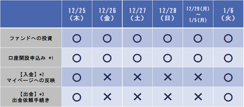 *3・・・12月25日15:00までの出金依頼については、12月26日にご本人様の登録金融機関口座に振り込まれます。12月25日15:00~2026年1月6日9:00までの出金依頼については、2026年1月7日にご本人様の登録金融機関口座に振り込まれます。