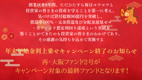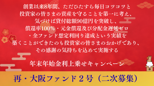 【年末年始金利上乗せキャンペーン 対象ファンド】再・大阪ファンド2号がキャンペーン対象の最終ファンドになります!