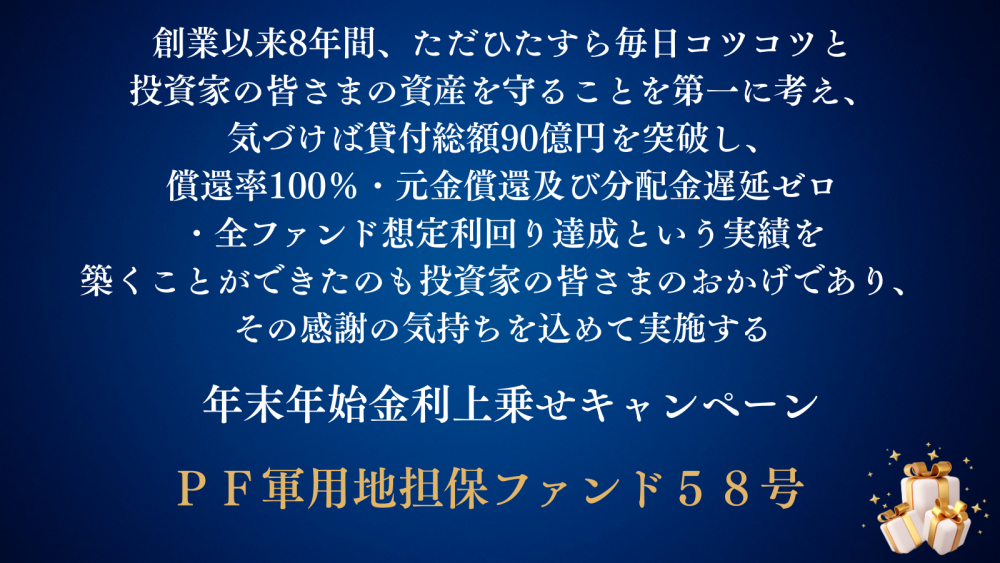 この度、PF軍用地担保ファンド58号【一部不動産担保付】として、総額851万円を募集いたします。
