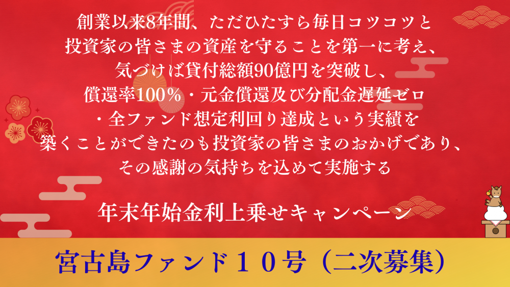 この度、宮古島ファンド10号(二次募集)【一部不動産担保付】として、総額572万円を募集いたします。