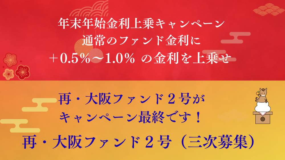 この度、再・大阪ファンド2号(三次募集)【一部不動産担保付】として、総額2,043万円を募集いたします。 年末年始金利上乗キャンペーン対象の最終ファンドになります!